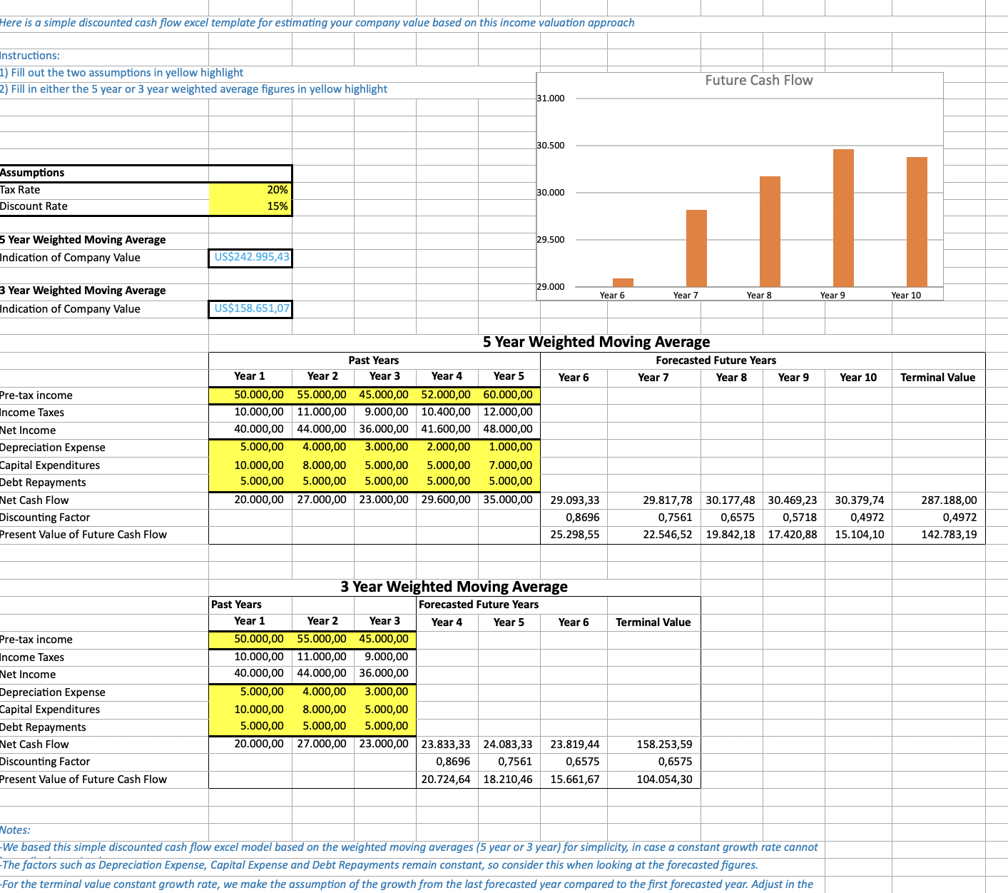 print(llama_parse_documents[1].text)Discounted Cash Flow Excel TemplateHere is a simple discounted cash flow excel template for estimating your company value based on this income valuation approachInstructions:1) Fill out the two assumptions in yellow highlight2) Fill in either the 5 year or 3 year weighted average figures in yellow highlightAssumptionsTax Rate 20%Discount Rate 15%5 Year Weighted Moving AverageIndication of Company Value $242,995.433 Year Weighted Moving AverageIndication of Company Value $158,651.07 5 Year Weighted Moving Average Past Years Forecasted Future Years Year 1 Year 2 Year 3 Year 4 Year 5 Year 6 Year 7 Year 8 Year 9 Year 10 Terminal ValuePre-tax income 50,000.00 55,000.00 45,000.00 52,000.00 60,000.00Income Taxes 10,000.00 11,000.00 9,000.00 10,400.00 12,000.00Net Income 40,000.00 44,000.00 36,000.00 41,600.00 48,000.00Depreciation Expense 5,000.00 4,000.00 3,000.00 2,000.00 1,000.00Capital Expenditures 10,000.00 8,000.00 5,000.00 5,000.00 7,000.00Debt Repayments 5,000.00 5,000.00 5,000.00 5,000.00 5,000.00Net Cash Flow 20,000.00 27,000.00 23,000.00 29,600.00 35,000.00 29,093.33 29,817.78 30,177.48 30,469.23 30,379.74 287,188.00Discounting Factor 0.8696 0.7561 0.6575 0.5718 0.4972 0.4972Present Value of Future Cash Flow 25,298.55 22,546.52 19,842.18 17,420.88 15,104.10 142,783.19 3 Year Weighted Moving Average Past Years Forecasted Future Years Year 1 Year 2 Year 3 Year 4 Year 5 Year 6 Terminal ValuePre-tax income 50,000.00 55,000.00 45,000.00Income Taxes 10,000.00 11,000.00 9,000.00Net Income 40,000.00 44,000.00 36,000.00Depreciation Expense 5,000.00 4,000.00 3,000.00Capital Expenditures 10,000.00 8,000.00 5,000.00Debt Repayments 5,000.00 5,000.00 5,000.00Net Cash Flow 20,000.00 27,000.00 23,000.00 23,833.33 24,083.33 23,819.44 158,253.59Discounting Factor 0.8696 0.7561 0.6575 0.6575Present Value of Future Cash Flow 20,724.64 18,210.46 15,661.67 104,054.30Notes:-We based this simple discounted cash flow excel model based on the weighted moving averages (5 year or 3 year) for simplicity, in case a constant growth rate cannot be easily determined.-The factors such as Depreciation Expense, Capital Expense and Debt Repayments remain constant, so consider this when looking at the forecasted figures.-For the terminal value constant growth rate, we make the assumption of the growth from the last forecasted year compared to the first forecasted year. Adjust in the formula as needed.(Optional) Ask Questions Over the Data