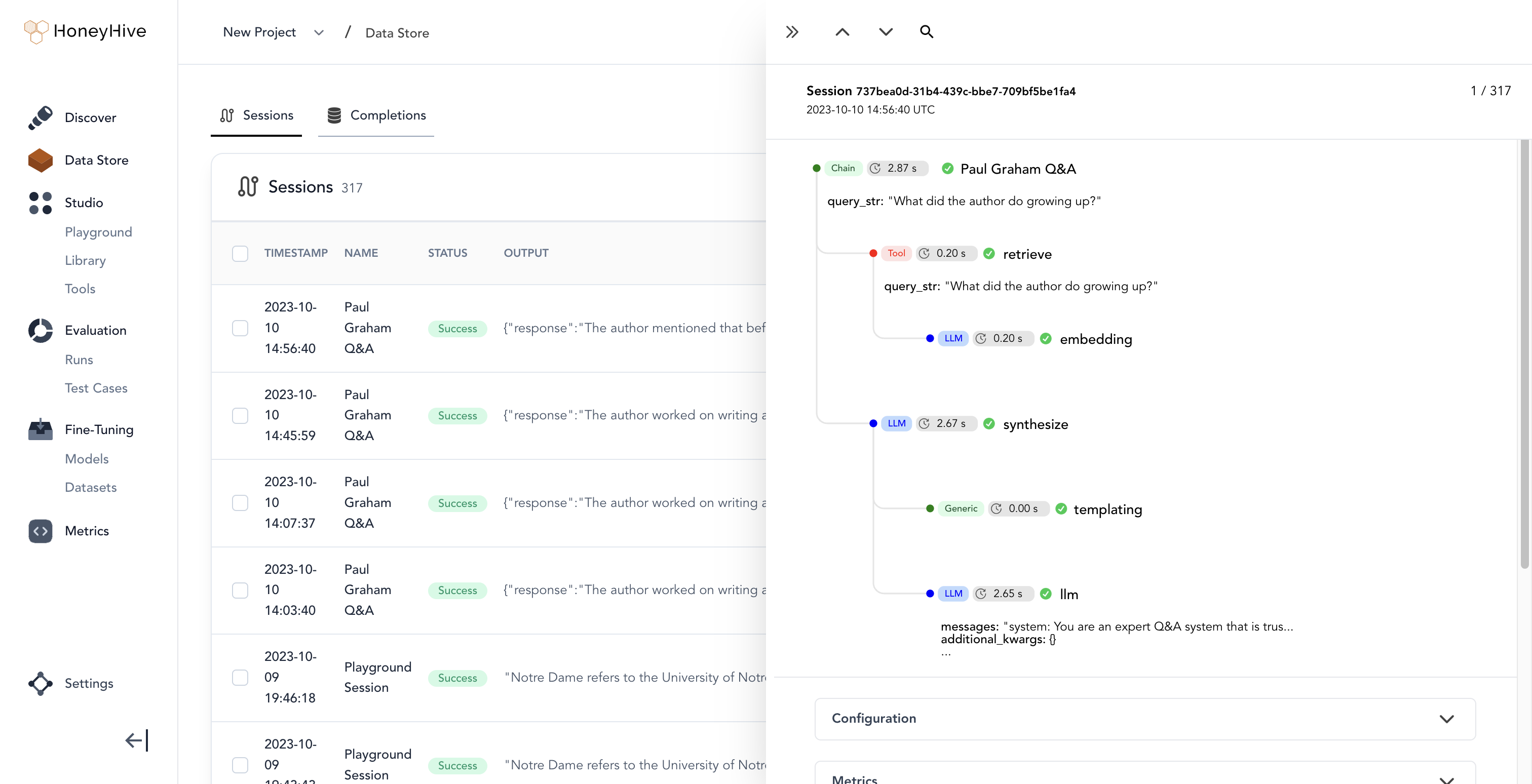 Section titled “HoneyHive”HoneyHive allows users to trace the execution flow of any LLM workflow. Users can then debug and analyze their traces, or customize feedback on specific trace events to create evaluation or fine-tuning datasets from production.
